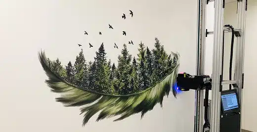 Druk ścienny polega na tym, że głowica nanosi tusz na ścianę lub inną powierzchnię pionową pasek po pasku. Drukujemy atramentem UV, a lampa UV na bieżąco utwardza ten tusz, dzięki czemu tusz trzyma się na dowolnej powierzchni pionowej i nie musi schnąć. Sprawdź tutaj, praca drukarki.